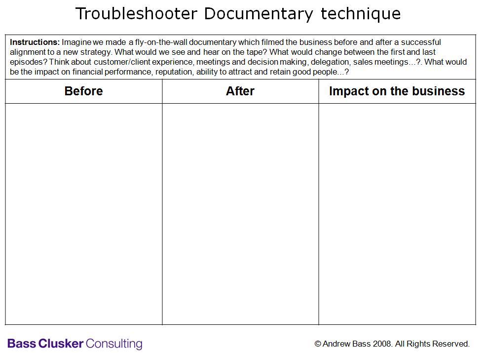 So I will often respond to statements such as those above by saying the following: “Image we did a Before-and-After documentary about the change process. The film crew would film the current situation, and then would come back at the end and film again. What differences would you want to see and hear on the two playbacks, so that you said to me: ‘LOOK! LISTEN! That’s the difference. That’s how I know they have taken ownership’ (or whatever the objective might be)?”